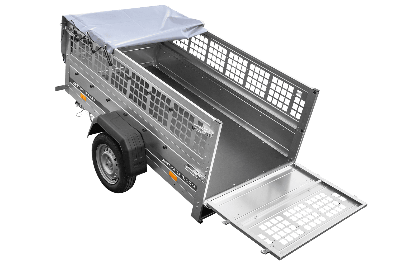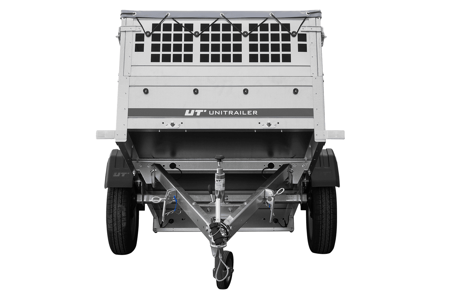 • Remorque grillagée UNITRAILER du modèle Garden Trailer 200 KIPP avec timon pliable. Surface de transport de 200x106 cm. Hauteur totale de 70 cm (incluant bâche et ridelles). PTAC 300-750 kg.