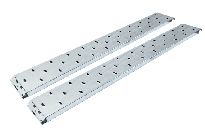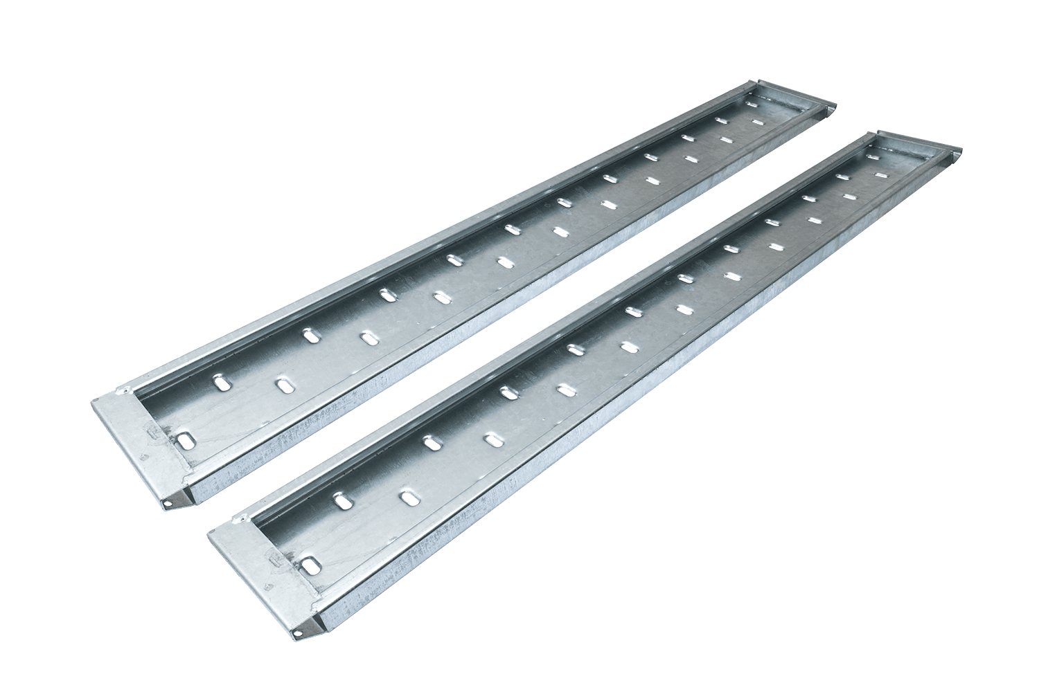 Un ensemble de deux rampes fabriquées par UNITRAILER pour remorques et dépanneuses, de 250 cm de long et d'une capacité de charge de 1 500 kg chacune. Les rampes sont fabriquées en acier durable et renforcées, ce qui garantit stabilité et fiabilité lors de l'utilisation.