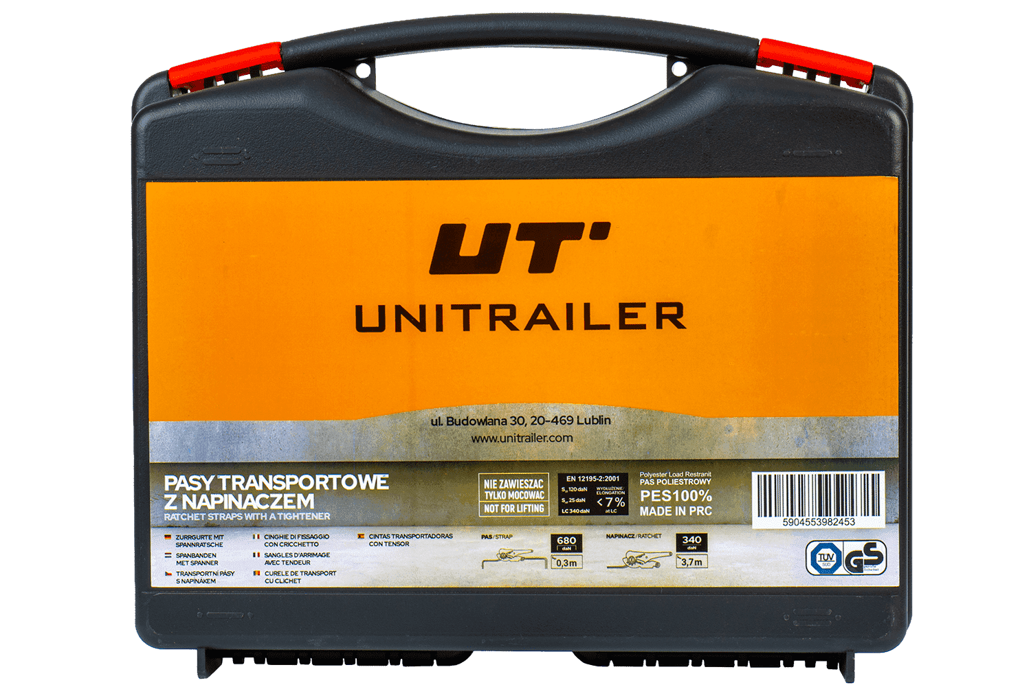 UNITRAILER se soucie de la qualité de ses sangles, qui sont constituées de matériaux solides et résistants à l'étirement. Tous les éléments métalliques - crochets et mécanisme de tension - sont fabriqués en acier durable et anticorrosion, ce qui permet leur utilisation sûre et à long terme dans diverses conditions météorologiques. Chaque sangle porte une étiquette claire, sécurisée avec du papier d'aluminium, avec des informations en polonais et en anglais. Pour plus de commodité et de sécurité, la charge de travail maximale a également été gravée sur la boucle et les crochets, ce qui vous permet de vérifier rapidement les paramètres de la sangle même si l'étiquette est endommagée.