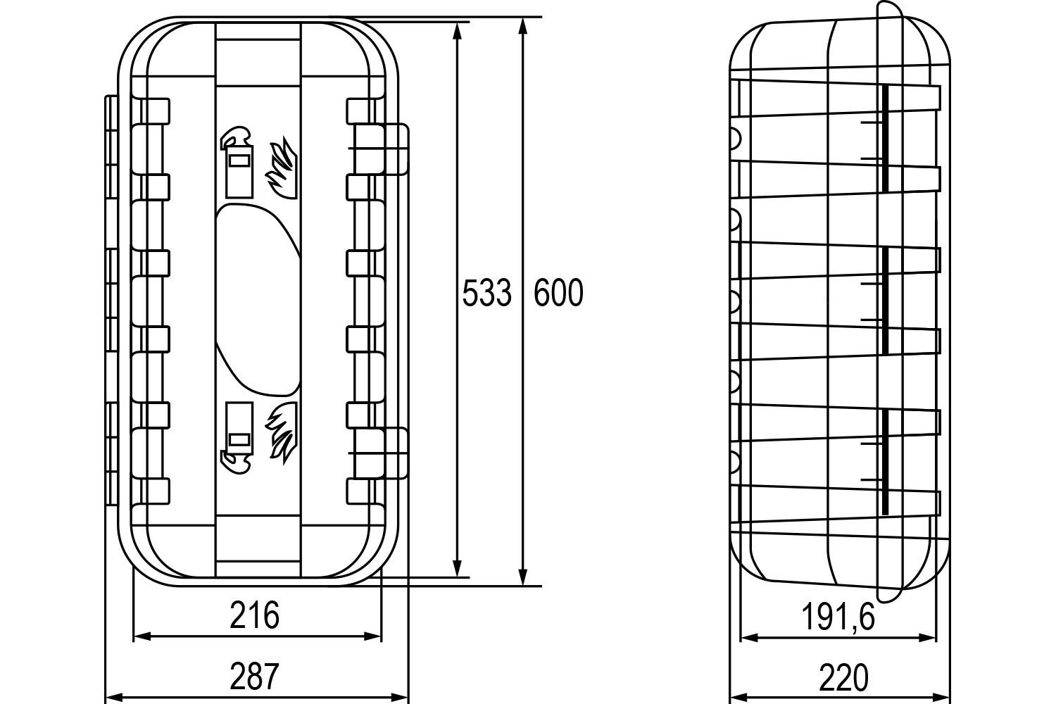 Le coffre à extincteur DAKEN STRIKE 82501 aux dimensions de 600 mm de hauteur, 287 mm de largeur et 220 mm de profondeur est une solution pratique et fiable pour stocker un extincteur de 6 kg dans les véhicules et remorques. La boîte noire est équipée d'un support pour extincteur d'un diamètre de 150-170 mm et d'une fenêtre d'inspection, qui permet de vérifier rapidement la présence et l'état de l'extincteur sans avoir à l'ouvrir, ce qui facilite une inspection régulière et assure une utilisation pratique .