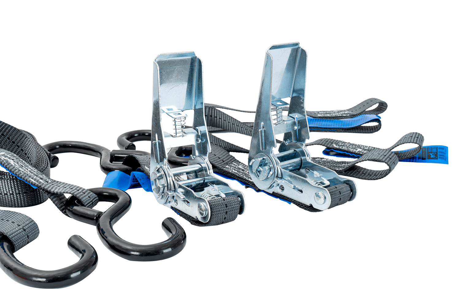 - Un ensemble de deux sangles et deux harnais pour sécuriser une moto HILLS d'une capacité de charge d'une tonne. La longueur totale des sangles avec cliquets est de 3 mètres, et celle des harnais de 0,45 mètre.