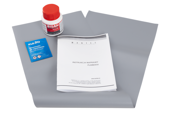 Le kit de réparation MANTES contient tout le nécessaire pour réparer efficacement une bâche endommagée : un matériau de bâche de 220x860 mm d'un grammage de 500 g/m², 125 ml de colle PVC BISAN avec un pinceau pratique pour une application précise, une lingette alcoolisée pour nettoyer soigneusement la surface avant le collage et des instructions claires qui vous guident étape par étape dans le processus de réparation, assurant une connexion durable et solide.