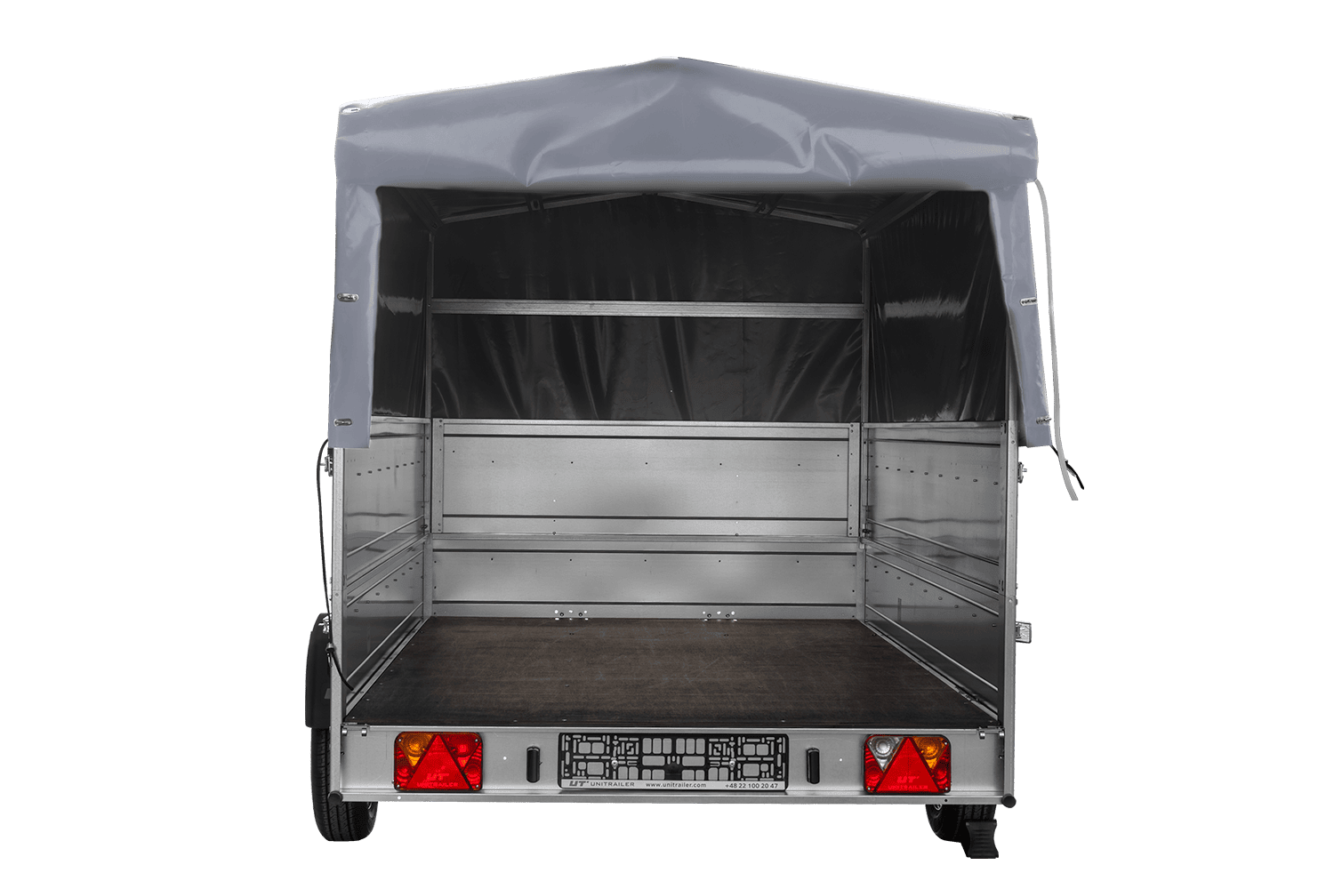 Remorque avec ridelles supplémentaires, châssis de 80 cm de hauteur et bâche grise est une remorque à un essieu avec un PTAC maximal de jusqu'à 750 kg. Pour faciliter le chargement et le déchargement, la remorque a la possibilité d'ouvrir ou de retirer la partie arrière. Le cadre mesure 80 cm de haut à son point le plus élevé et possède un pignon supérieur pour un meilleur drainage de l'eau et de la neige pendant la conduite. Elle est constituée de poutres en acier très solides protégées contre la rouille par galvanisation. Le cadre est assemblé à l'aide de vis incluses dans le kit. L’ensemble crée un cadre solide et stable pour la bâche. La bâche est faite de tissu épais et imperméable matériau d'un poids de 630 g/m2 et même des pluies prolongées ne provoqueront pas de fuite. L'ensemble comprend également cordon élastique avec des crochets qui permettent de le serrer rapidement. La bâche est équipée d'une partie arrière ouvrante , qui facilite le chargement et le déchargement des marchandises de la remorque. Il n’est pas nécessaire de retirer toute la bâche pour accéder aux marchandises transportées. Il suffit de soulever les deux sangles qui maintiennent la partie arrière de la bâche contre tout soulèvement intempestif pendant la conduite ou l'arrêt. Il suffit ensuite d'enrouler cette partie et de la placer sur la poutre supérieure du cadre. Cela vous permet d'accéder facilement à l'intérieur de la remorque, même sans avoir à ouvrir la ridelle arrière.