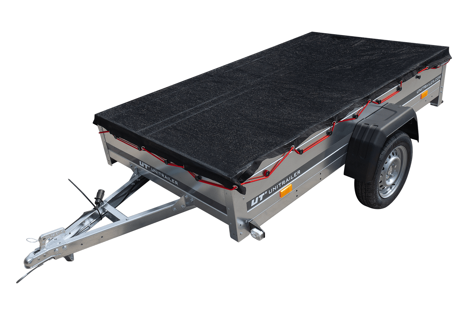 Le produit est équipé d' un cordon élastique cousu sur tout le périmètre, ce qui permet une installation rapide et stable sur différents types de remorques. Son matériau noir durable est non seulement esthétique, mais aussi résistant aux intempéries, permettant ainsi une utilisation durable dans toutes les conditions météorologiques.