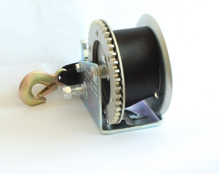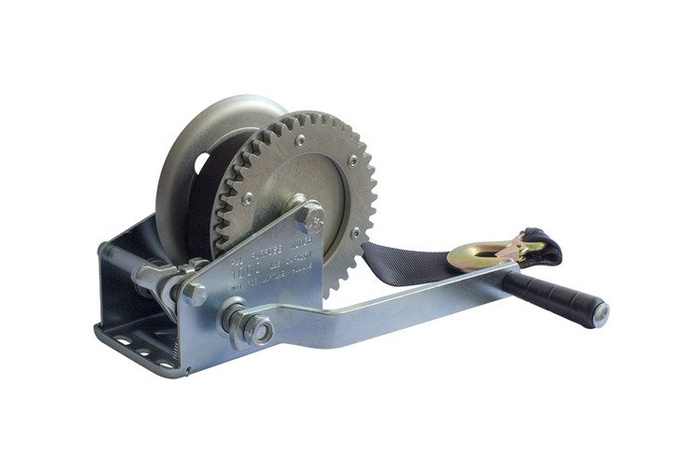 Treuil manuel à manivelle Knott 450 kg destiné aux remorques porte bateau. Treuil avec manivelle vis et sangle 7 m avec crochet. 2 vitesses.