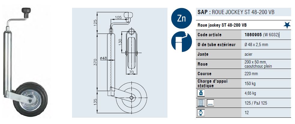 • Roue jockey 48 mm zinguée produite par Winterhoff pour les remorques de voiture. Diamètre du tube de 48 mm, charge maximale de 150 kg.