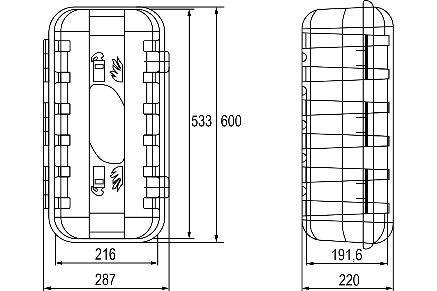 Le coffre à extincteur DAKEN STRIKE 82500 aux dimensions de 600 mm de haut, 287 mm de large et 220 mm de profondeur est une solution pratique et fiable pour stocker un extincteur de 6 kg dans les véhicules et remorques. Fabriquée en rouge, la boîte est bien visible, dispose d'un support pour extincteur d'un diamètre de 150-170 mm, et d'une fenêtre d'inspection qui permet de vérifier rapidement la présence et l'état de l'extincteur sans avoir à ouvrir la boîte, ce qui facilite une inspection régulière et garantit une utilisation pratique.