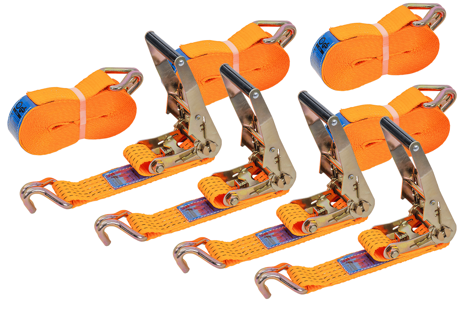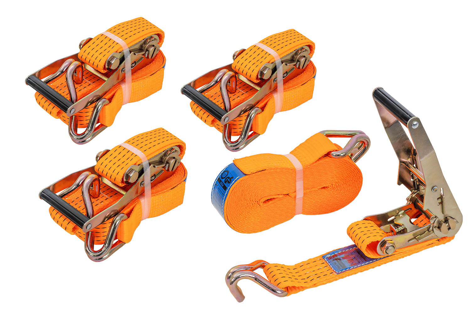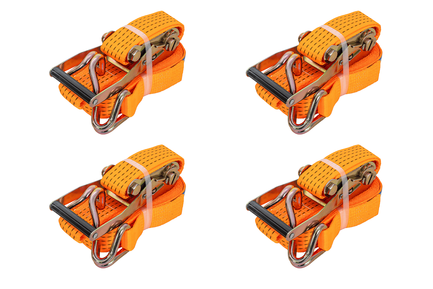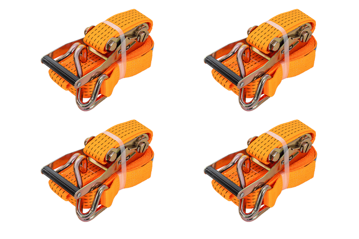 Un jeu de quatre sangles à cliquet UNITRAILER orange avec tendeurs , chacune composée de deux parties : une partie courte avec cliquet et crochet, et une partie longue avec sangle et crochet. La longueur totale de chaque sangle, sangle et boucle comprises, est de 8 mètres , ce qui est suffisant pour arrimer des charges plus importantes. La largeur de la sangle de 50 mm assure une pression suffisante. Chaque sangle offre une force de tension robuste allant jusqu'à 5 tonnes (5 000 daN) , ce qui en fait l'ensemble idéal pour arrimer des charges plus lourdes nécessitant plusieurs points d'arrimage.
