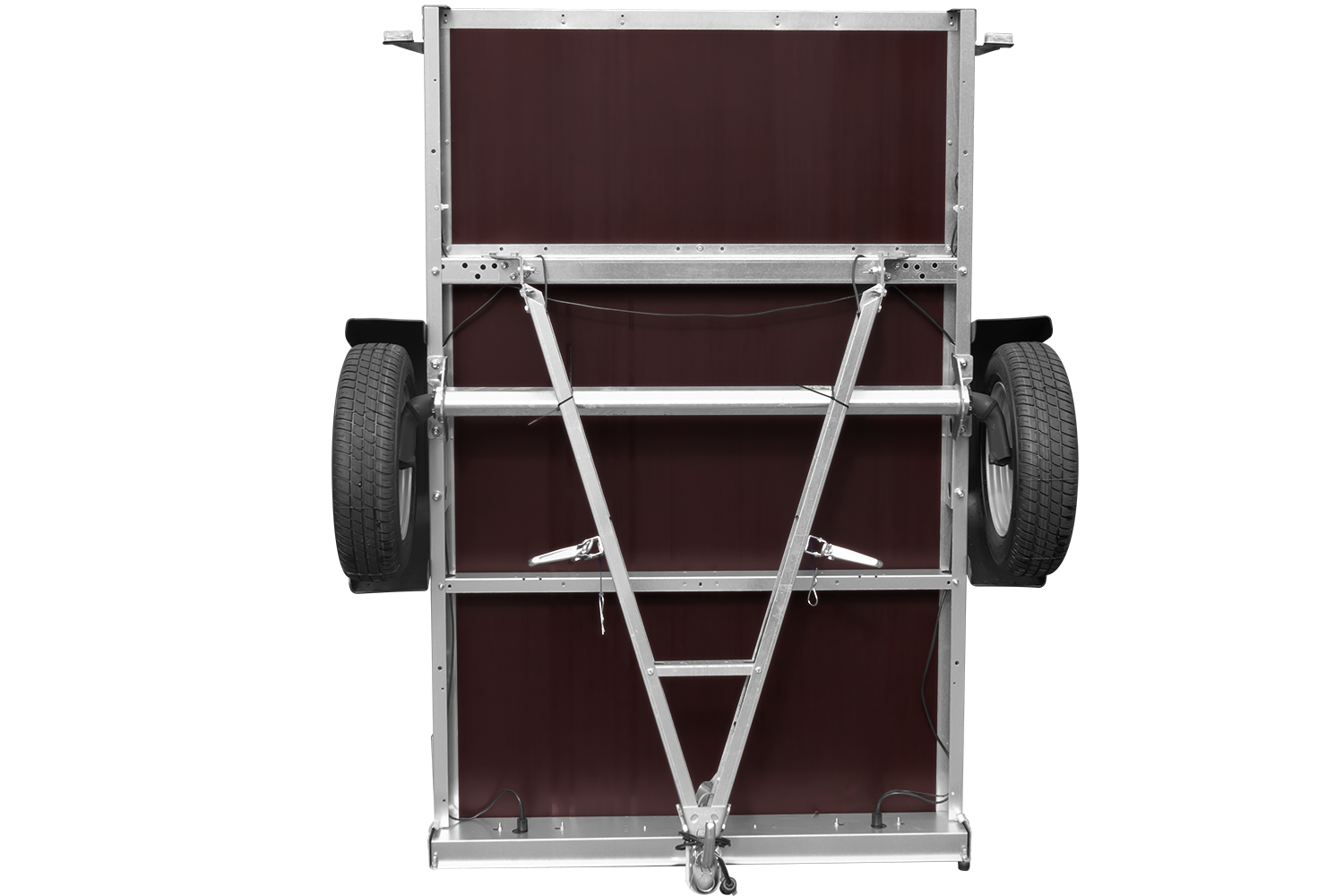 Grâce au timon pliable, vous pouvez charger ou décharger la cargaison beaucoup plus facile que normalement. Cette solution est également utilisée dans les remorques plus chères. Un autre des avantages de cette solution est la possibilité de stocker la remorque dans une position verticale avec un timon plié, debout à l'arrière. Vous n'avez donc pas à vous soucier que la remorque prenne beaucoup de place dans le garage ou ne rentre pas à cause du timon trop long. Vous pouvez la mettre même sur la façade du bâtiment !