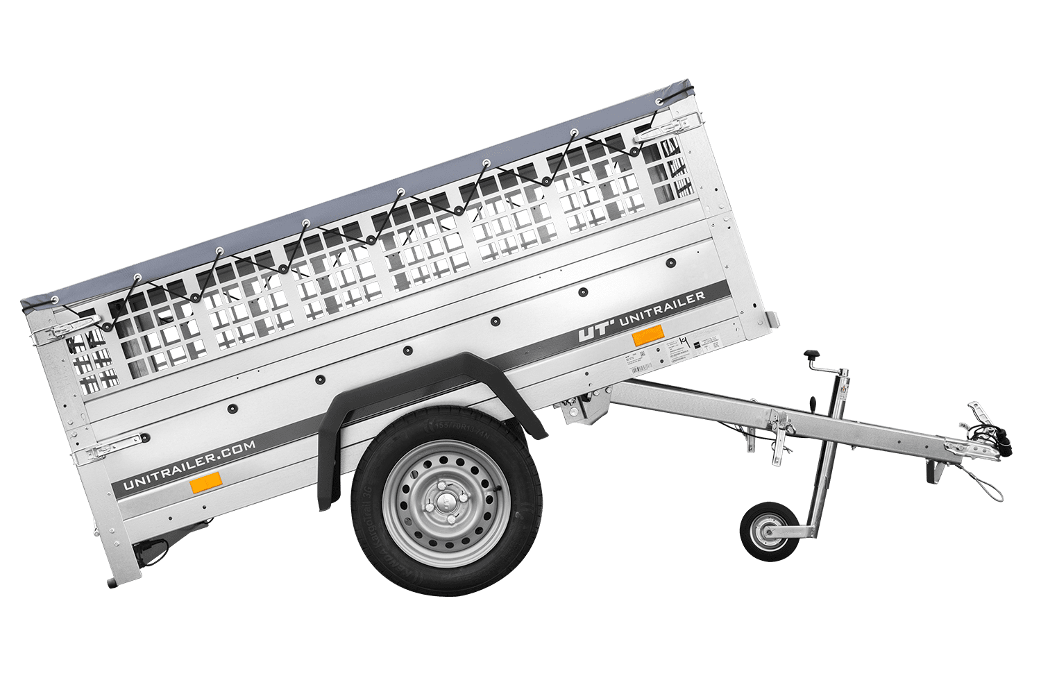 • Remorque grillagée UNITRAILER du modèle Garden Trailer 200 KIPP avec timon pliable. Surface de transport de 200x106 cm. Hauteur totale de 70 cm (incluant bâche et ridelles). PTAC 300-750 kg.