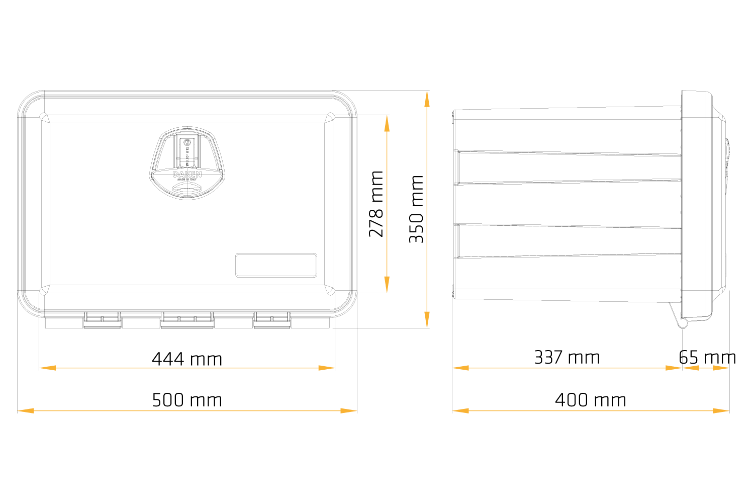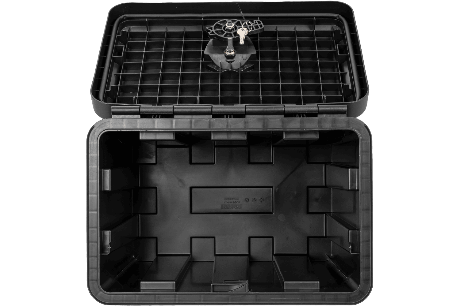 La boîte est fabriquée en polypropylène et en nylon de haute qualité, renforcés par des nervures, ce qui augmente sa durabilité et sa résistance aux dommages mécaniques. Le matériau offre une protection exceptionnelle contre le feu, l'eau, la poussière, le carburant, les rayons UV et les températures extrêmes, ce qui en fait une solution idéale pour une utilisation intensive dans des conditions difficiles. Le couvercle de la boîte est équipé d'un joint en caoutchouc qui assure une étanchéité totale, empêchant l'eau et la poussière de pénétrer à l'intérieur. Cette conception protège efficacement les outils et équipements stockés contre les agressions extérieures néfastes, ce qui est particulièrement important en cas d'utilisation intensive sur des chantiers ou dans des conditions météorologiques difficiles.