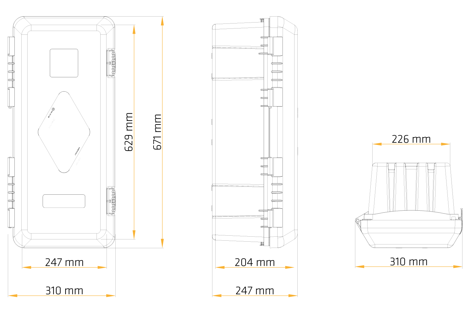Le coffre pour extincteur est fabriqué en polypropylène, nylon et polycarbonate de haute qualité, garantissant une durabilité et une résistance exceptionnelles aux dommages mécaniques. Ces matériaux offrent une excellente protection contre le feu, l'eau, la poussière, le carburant, les rayons UV et les températures extrêmes, ce qui le rend idéal pour les conditions d'utilisation difficiles. Sa construction robuste protège le contenu des influences extérieures nocives, et la fenêtre d'inspection permet de vérifier rapidement l'état de l'extincteur, garantissant confort et sécurité d'utilisation.