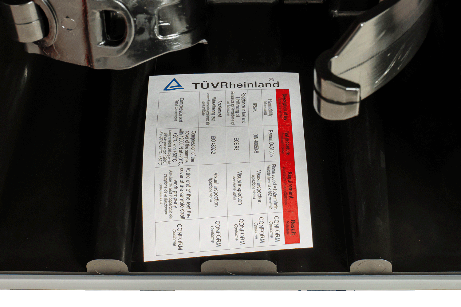Le boîtier de l'extincteur est approuvé par le VCA en tant que système de protection latérale, Certificat E11 73 R - 011168 et tests de laboratoire L'homologation TÜV Rheinland. VCA confirme que le produit peut être utilisé comme élément de protection latérale du véhicule, répondant ainsi à des exigences de sécurité strictes pour la protection des autres usagers de la route. Ces certificats témoignent de la haute qualité du produit et de sa conformité aux normes internationales de sécurité routière.