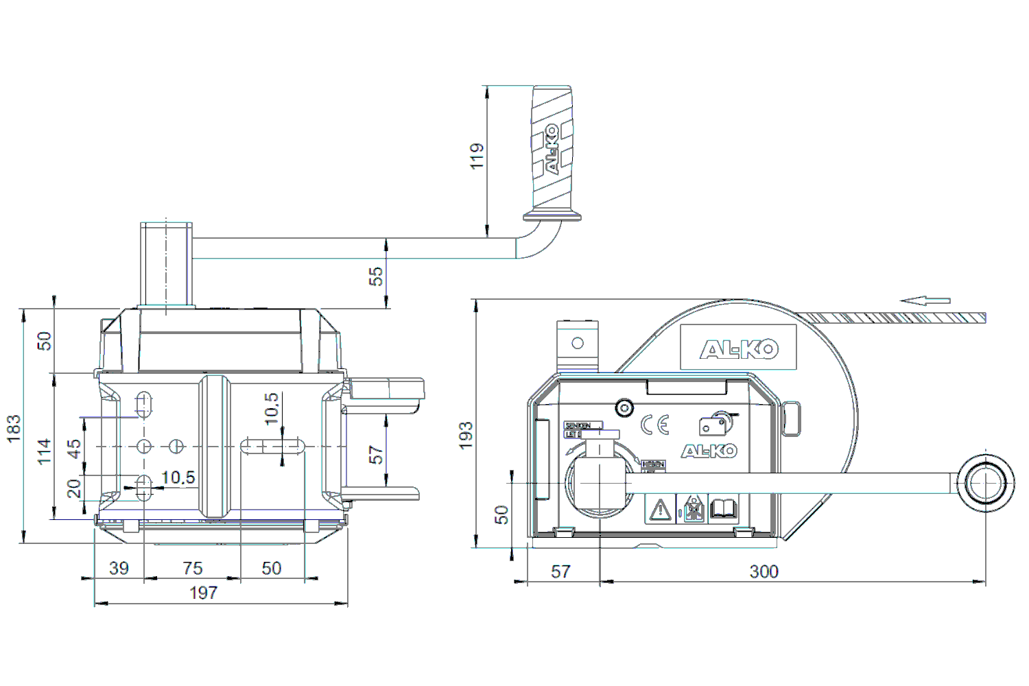 - Treuil à câble manuel avec frein automatique activé par le poids de traction et déroulement automatique. Treuil de la célèbre société AL-KO, type 901 PLUS A, d'une capacité de charge maximale de 900 kg.
