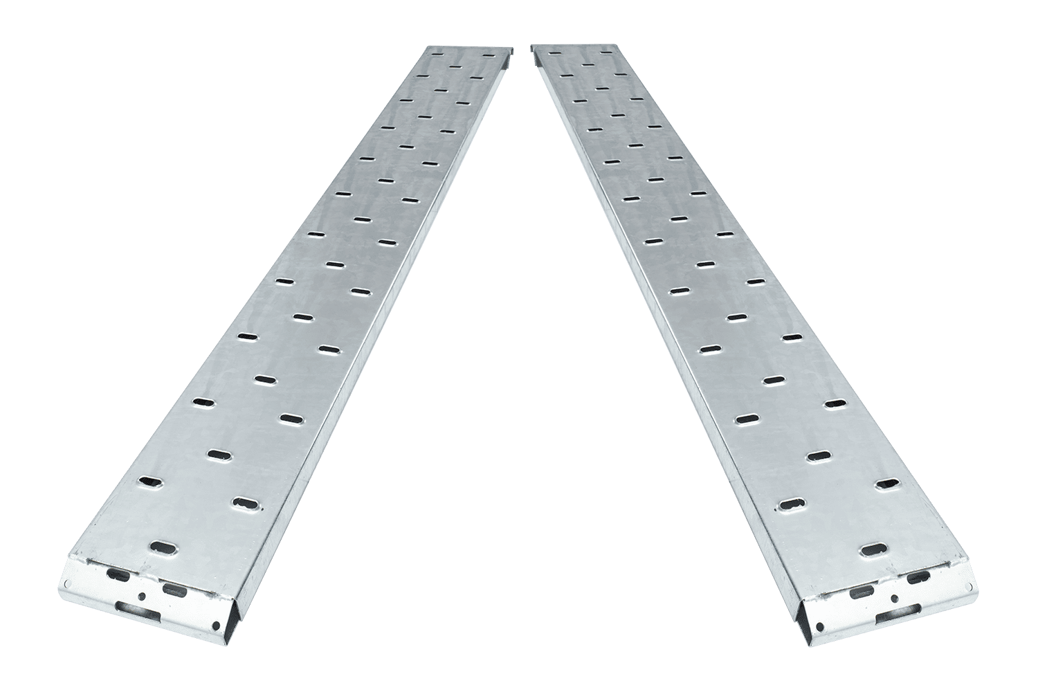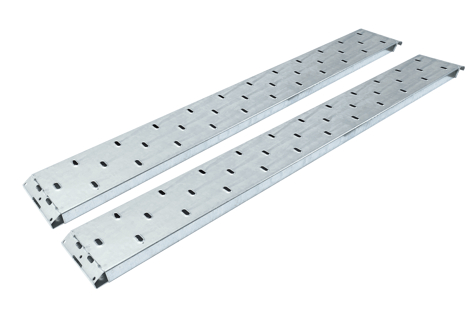 Un ensemble de deux rampes fabriquées par UNITRAILER pour remorques et dépanneuses, de 250 cm de long et d'une capacité de charge de 1 500 kg chacune. Les rampes sont fabriquées en acier durable et renforcées, ce qui garantit stabilité et fiabilité lors de l'utilisation.