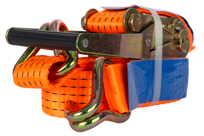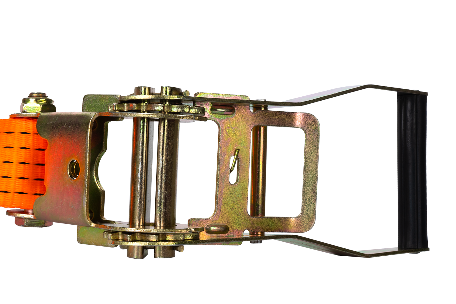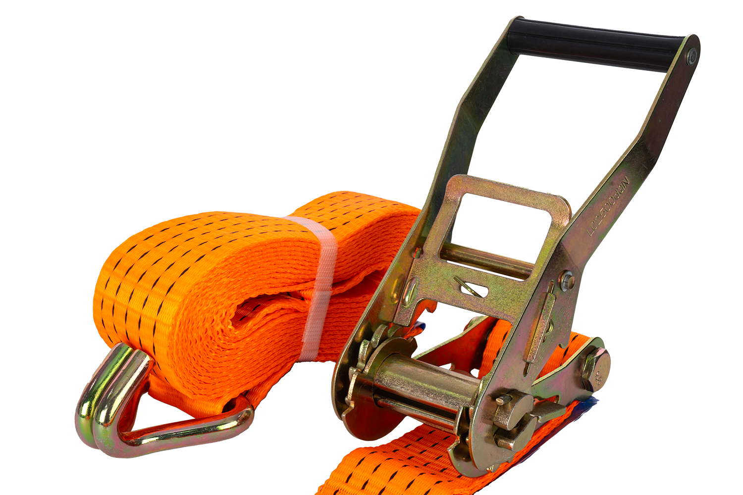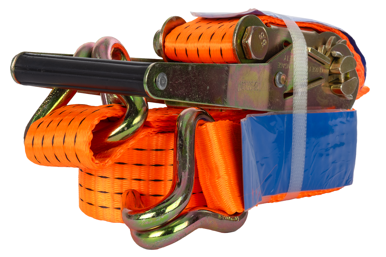 La sangle à cliquet orange UNITRAILER se compose de deux parties : une partie courte avec cliquet et crochet, et une partie longue avec sangle et crochet. Sa longueur totale, sangle et boucle comprises, est de 5 mètres, ce qui est suffisant pour arrimer des charges plus importantes. La largeur de la sangle, de 50 mm, assure une pression optimale. Sa résistance à la tension, jusqu'à 5 tonnes (5000 daN) , la rend idéale pour l'arrimage de charges plus lourdes.