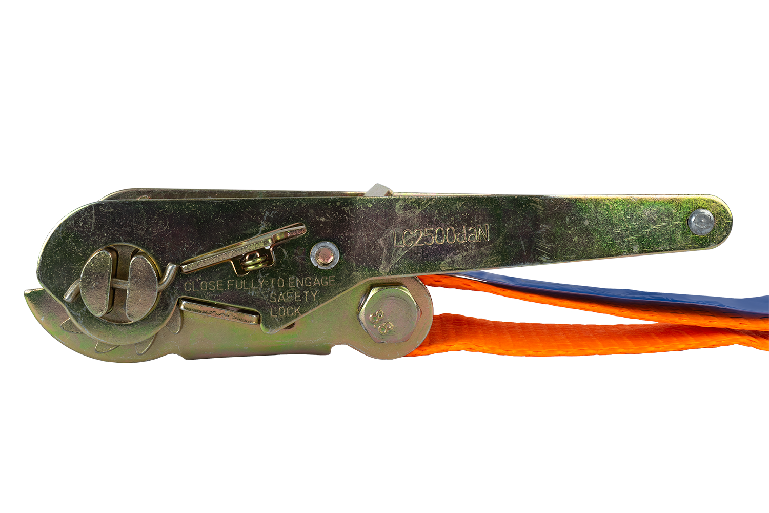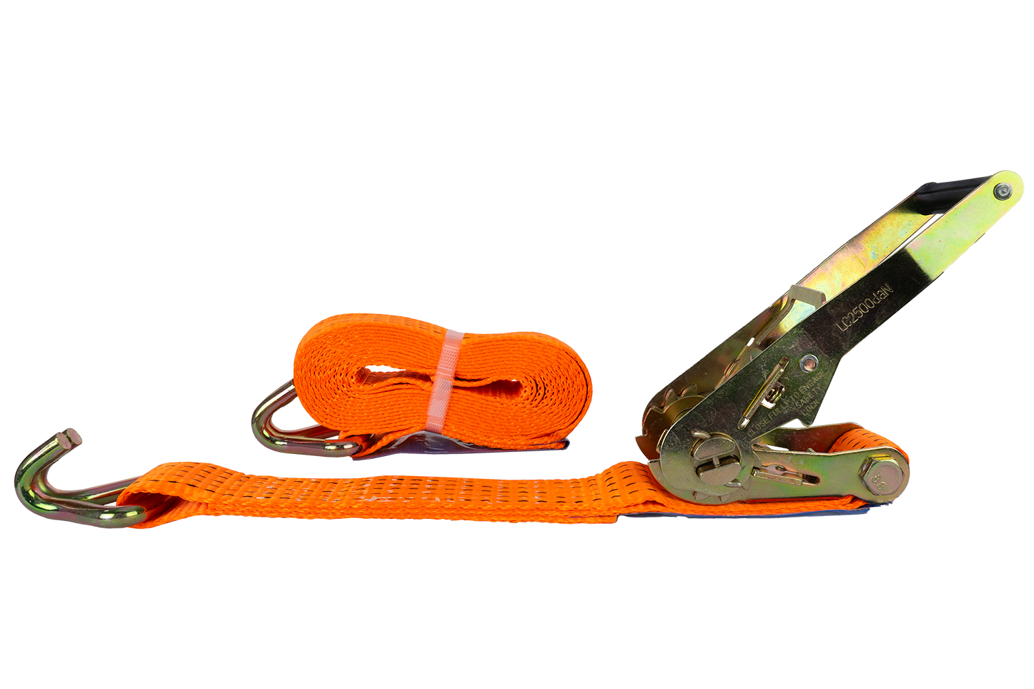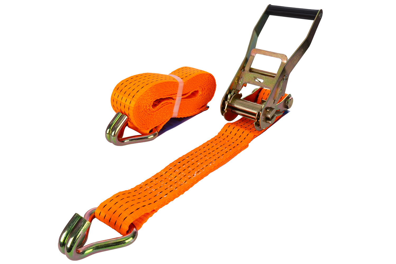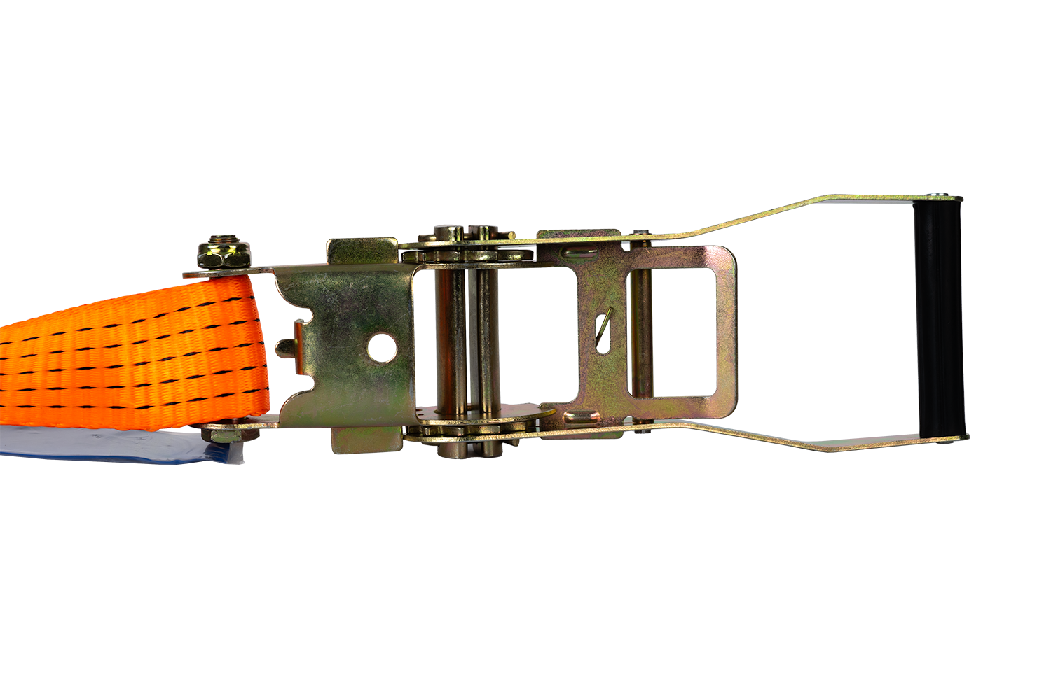 La sangle à cliquet orange UNITRAILER se compose de deux parties : une partie courte avec cliquet et crochet, et une partie longue avec sangle et crochet. Sa longueur totale, sangle et boucle comprises, est de 5 mètres, ce qui est suffisant pour arrimer des charges plus importantes. La largeur de la sangle, de 50 mm, assure une pression optimale. Sa résistance à la tension, jusqu'à 5 tonnes (5000 daN) , la rend idéale pour l'arrimage de charges plus lourdes.