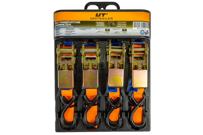 UNITRAILER se soucie de la qualité de ses sangles, qui sont constituées de matériaux solides et résistants à l'étirement. Tous les éléments métalliques - crochets et mécanisme de tension - sont fabriqués en acier durable et anticorrosion, ce qui permet leur utilisation sûre et à long terme dans diverses conditions météorologiques. Chaque sangle porte une étiquette claire, sécurisée avec du papier d'aluminium, avec des informations en polonais et en anglais. Pour plus de commodité et de sécurité, la charge de travail maximale a également été gravée sur la boucle et les crochets, ce qui vous permet de vérifier rapidement les paramètres de la sangle même si l'étiquette est endommagée.