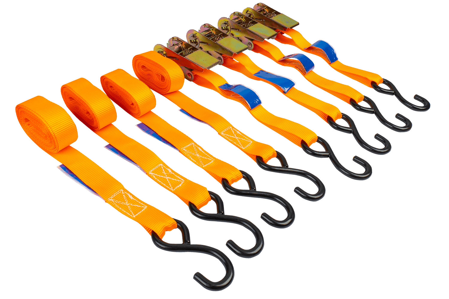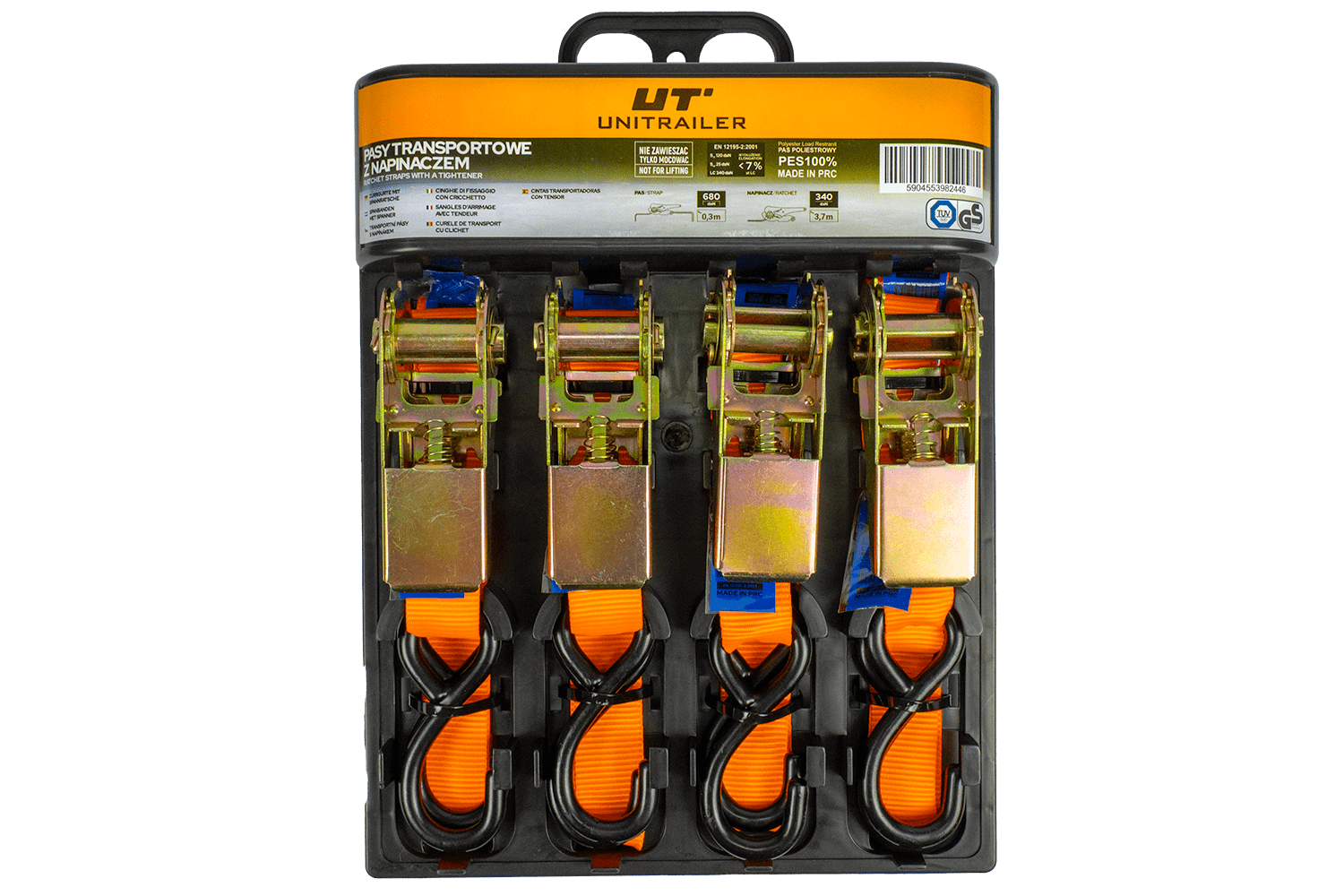 Un jeu de quatre courroies, sangles de transport UNITRAILER orange avec tendeur, chaque sangle est composée de deux parties : une plus courte avec un tendeur (c'est à dire un hochet) et un crochet et une plus longue avec une sangle se terminant également par un crochet. La longueur totale de chaque sangle, y compris la sangle et la boucle, est de 4 mètres, offrant une longueur adéquate pour une variété d'applications de transport. La largeur de la sangle de 25 mm offre une surface de pression optimale. Chaque sangle a une résistance de 0,68 tonne (680 daN), ce qui fait de cet ensemble une solution idéale pour sécuriser en toute sécurité de petites charges telles que du matériel de jardinage, des matériaux de construction légers ou du matériel d'atelier pendant le transport.