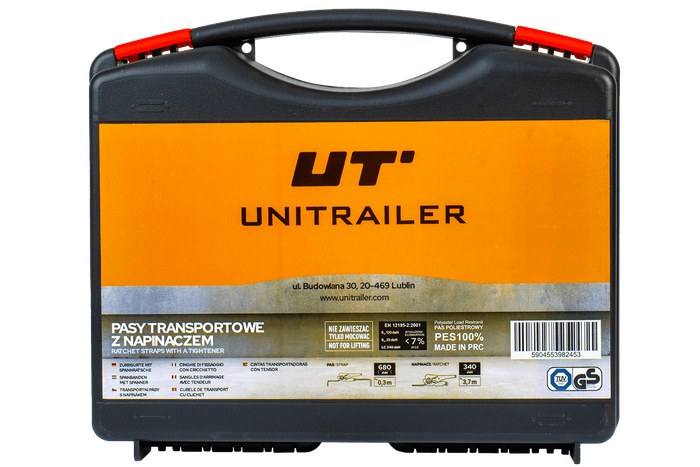 UNITRAILER se soucie de la qualité de ses sangles, qui sont constituées de matériaux solides et résistants à l'étirement. Tous les éléments métalliques - crochets et mécanisme de tension - sont fabriqués en acier durable et anticorrosion, ce qui permet leur utilisation sûre et à long terme dans diverses conditions météorologiques. Chaque sangle porte une étiquette claire, sécurisée avec du papier d'aluminium, avec des informations en polonais et en anglais. Pour plus de commodité et de sécurité, la charge de travail maximale a également été gravée sur la boucle et les crochets, ce qui vous permet de vérifier rapidement les paramètres de la sangle même si l'étiquette est endommagée.