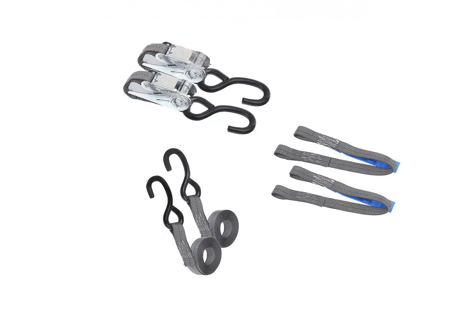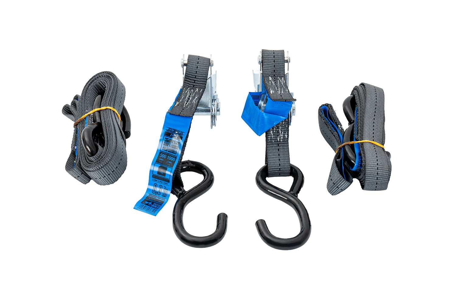 - Un ensemble de deux sangles et deux harnais pour sécuriser une moto HILLS d'une capacité de charge d'une tonne. La longueur totale des sangles avec cliquets est de 3 mètres, et celle des harnais de 0,45 mètre.