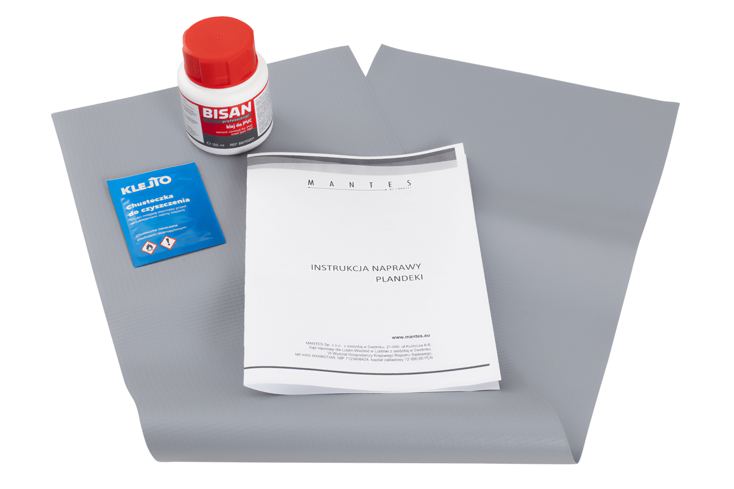 Le kit de réparation MANTES contient tout le nécessaire pour réparer efficacement une bâche endommagée : un matériau de bâche de 220x860 mm d'un grammage de 500 g/m², 125 ml de colle PVC BISAN avec un pinceau pratique pour une application précise, une lingette alcoolisée pour nettoyer soigneusement la surface avant le collage et des instructions claires qui vous guident étape par étape dans le processus de réparation, assurant une connexion durable et solide.
