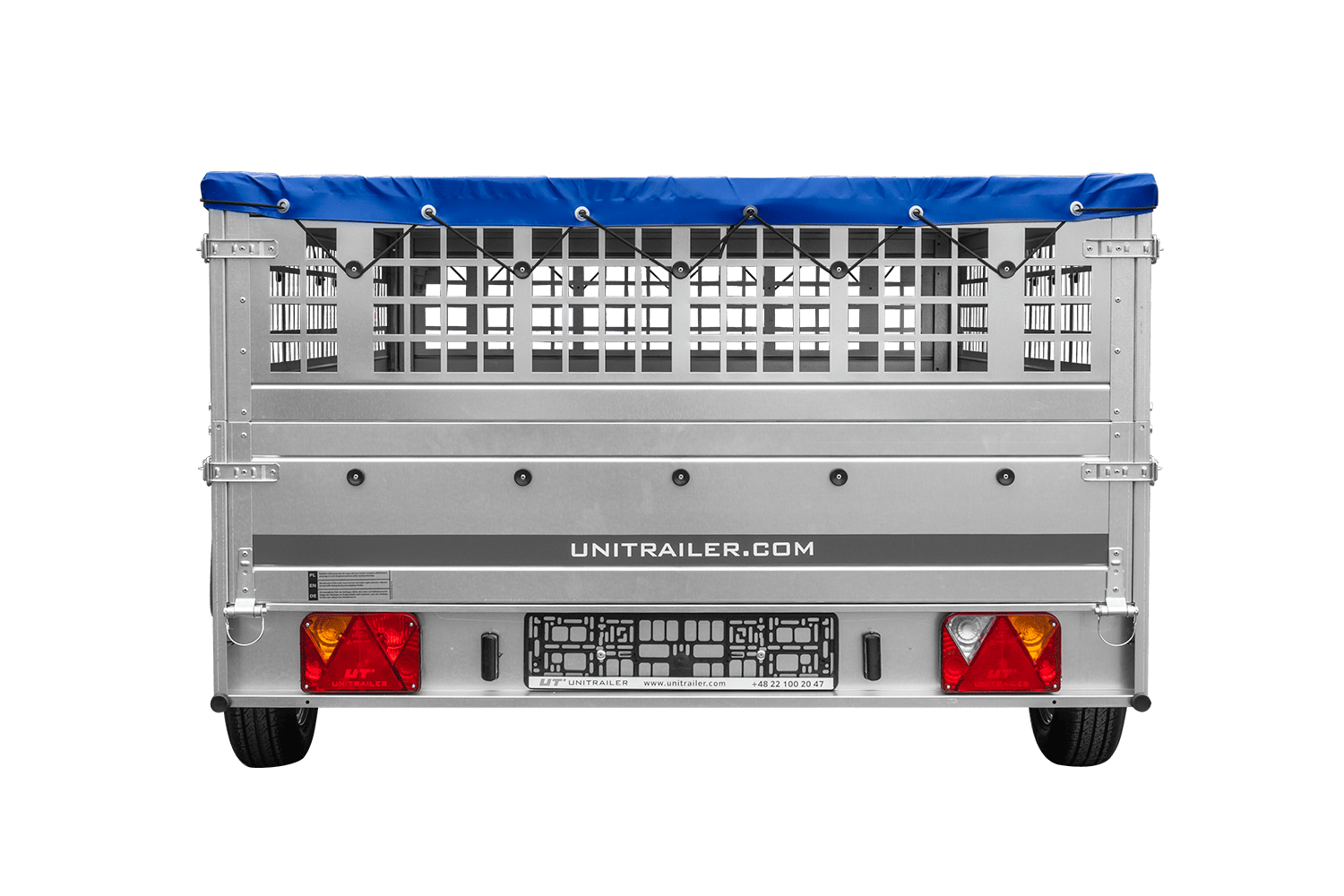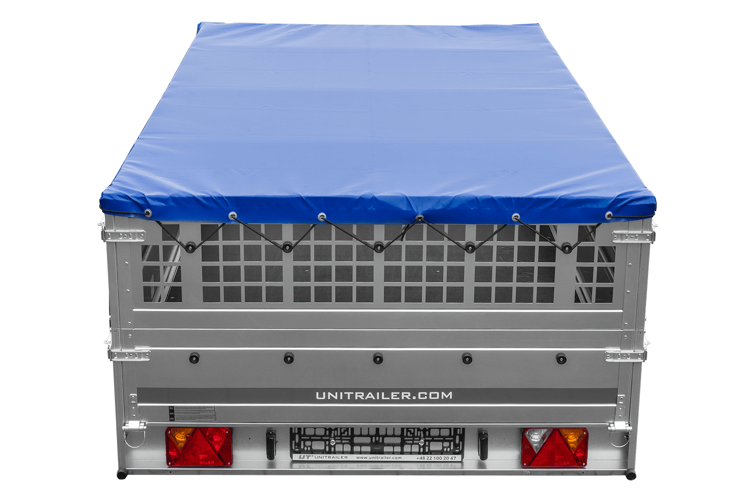 La remorque avec côtés grillagés, châssis plat et bâche bleue est une remorque à un seul essieu avec un PTAC maximal de jusqu'à 750 kg. Pour faciliter le chargement et le déchargement, la remorque a la possibilité d'ouvrir ou de retirer la partie arrière. La bâche grise protège efficacement la charge des précipitations et du soleil, et le cadre plat empêche la couverture de s'effondrer vers l'intérieur sous le poids de la pluie ou de la neige. La bâche est faite d'un matériau épais et imperméable matériau d'un poids de 630 g/m2 et même des pluies prolongées ne provoqueront pas de fuite. Des parois latérales supplémentaires amovibles en filet d'une hauteur de 40 cm offrent jusqu'à 70 cm d'espace de transport.