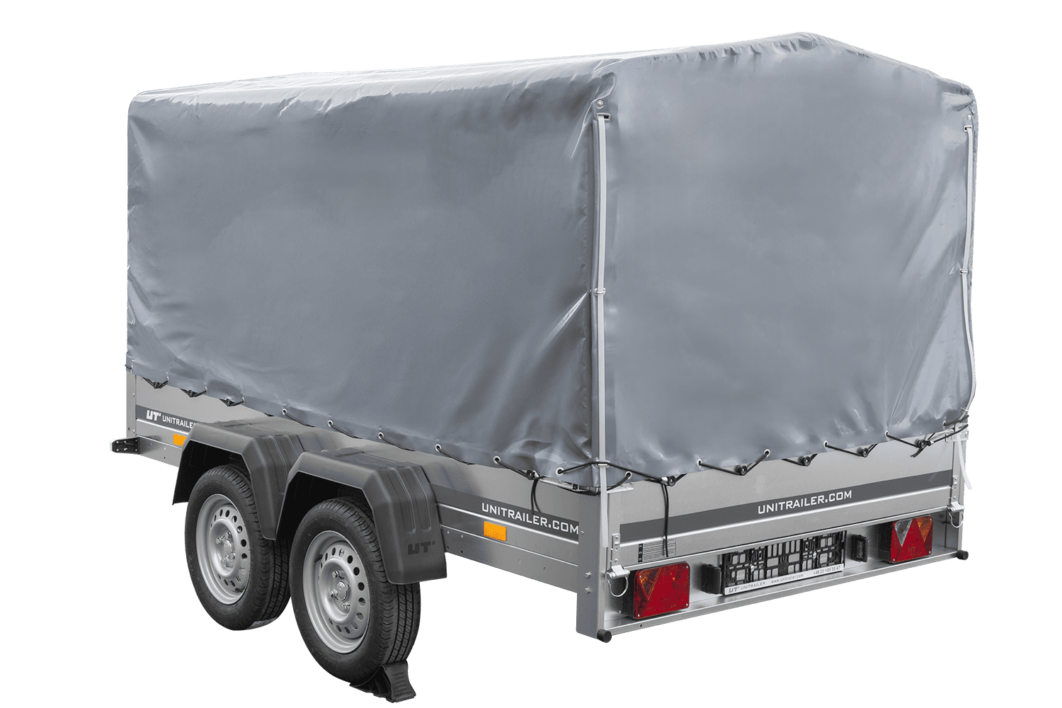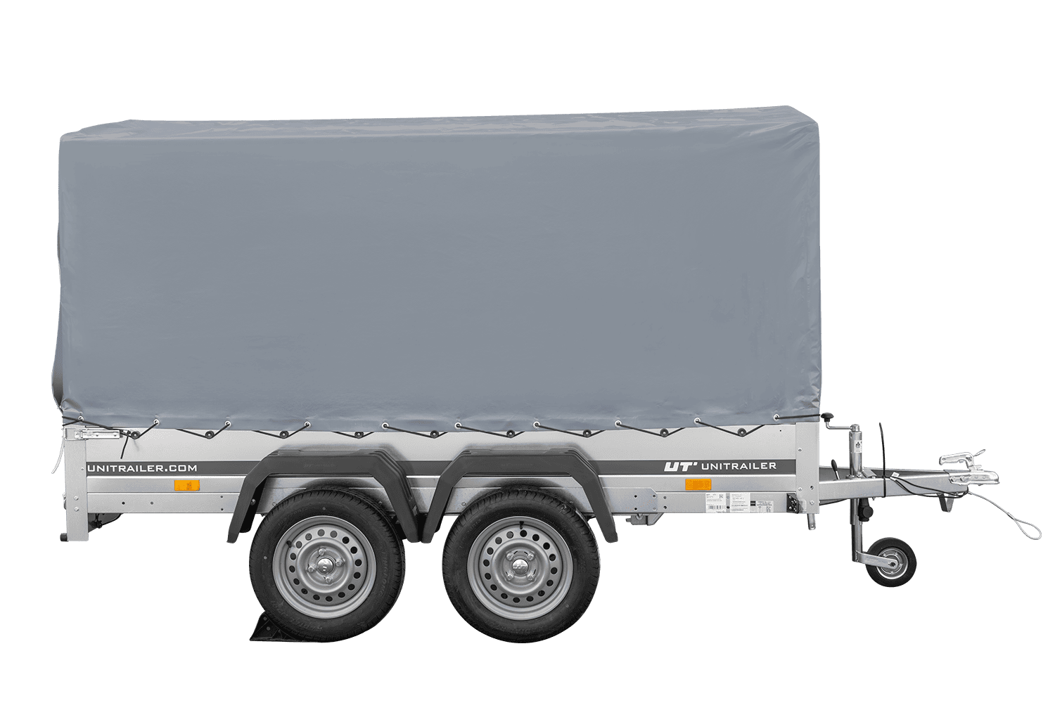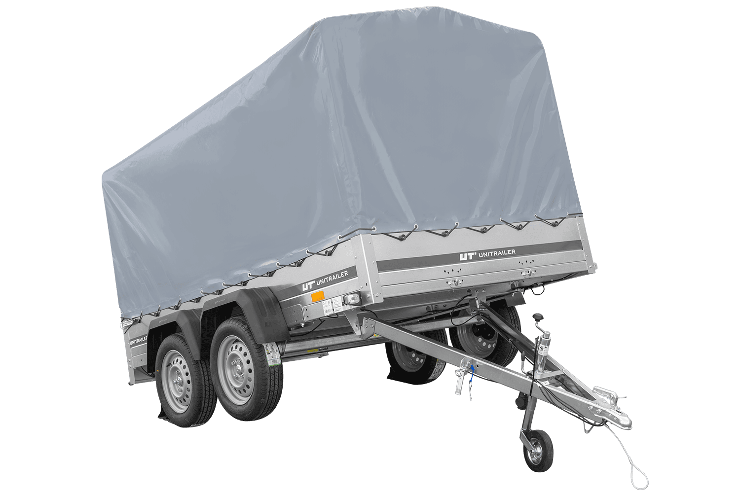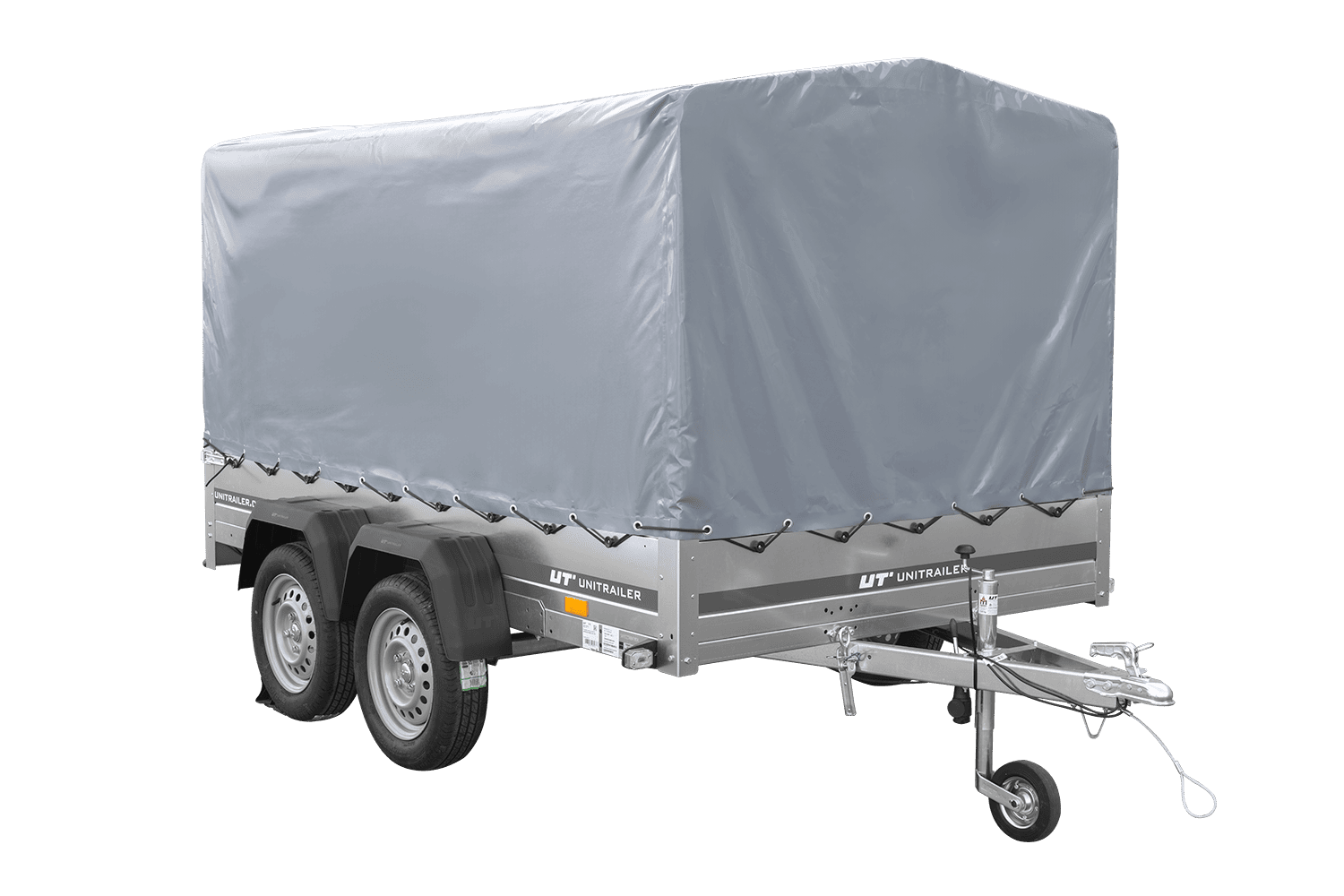 - Remorque voiture à deux essieux UNITRAILER Garden 265 Kipp, largeur 150 cm, avec châssis H-1100 et bâche grise. Encore plus d'espace de chargement vous permet de transporter plus de marchandises.