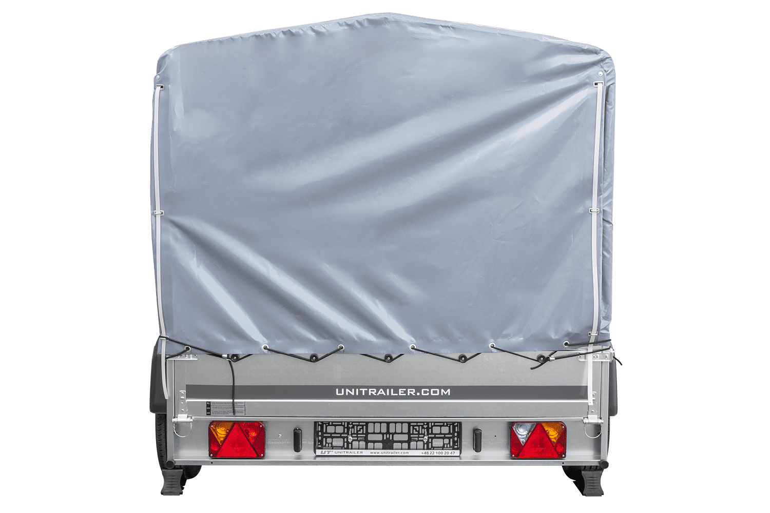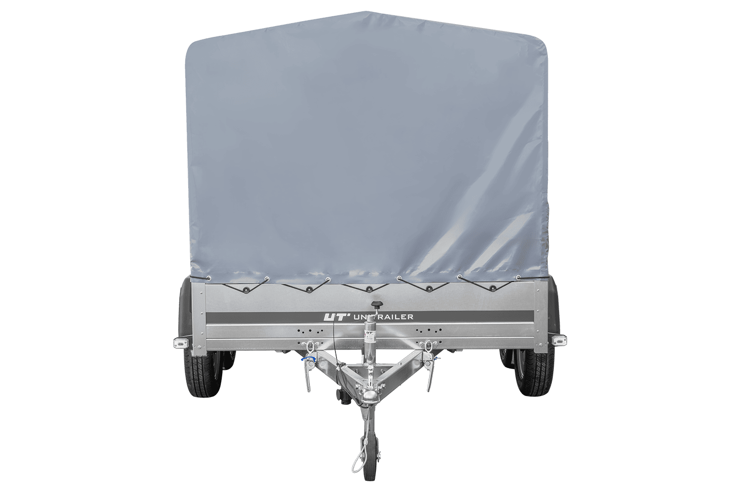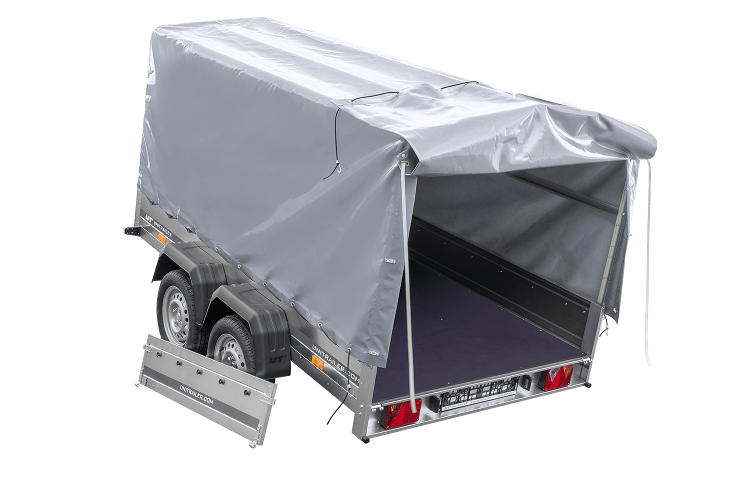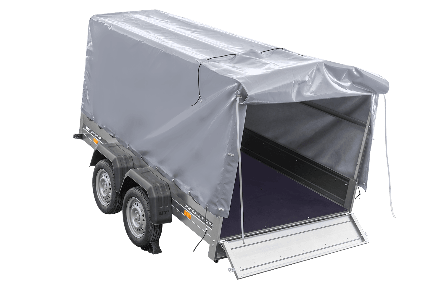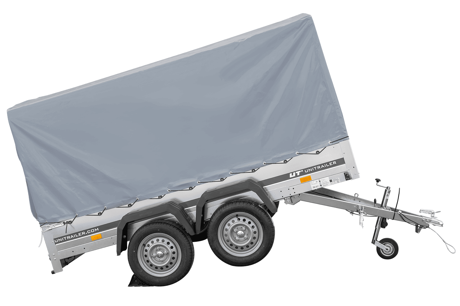 - Remorque voiture à deux essieux UNITRAILER Garden 265 Kipp, largeur 150 cm, avec châssis H-1100 et bâche grise. Encore plus d'espace de chargement vous permet de transporter plus de marchandises.